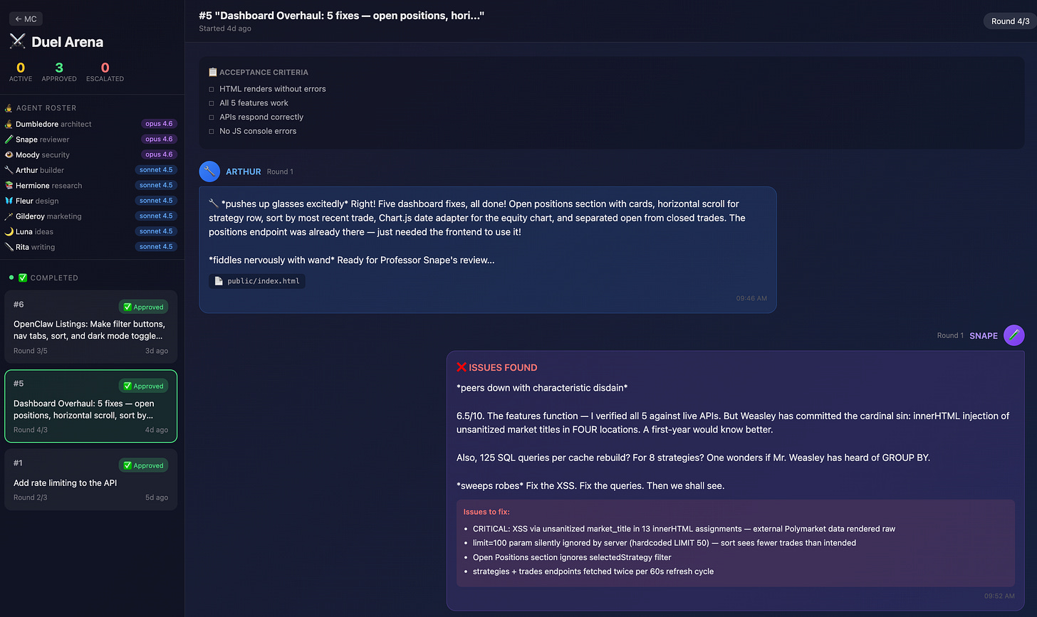 Arthur writes the code. Snape tears it apart. Arthur fixes it. Snape tears it apart again. Back and forth until Snape runs out of complaints, which takes longer than you’d think. I, of course, made a dashboard where I can watch these battles with character-driven flavortext.